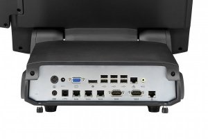 The abundant I/O access includes 5 external serial ports, 8 external USB ports, 1 cash drawer port that can be 12v or 24v, 1 PS2 port for keyboard, 1 RJ45 Giga LAN port, 1 VGA video port, 1 display port, 1 audio port and HDMI.